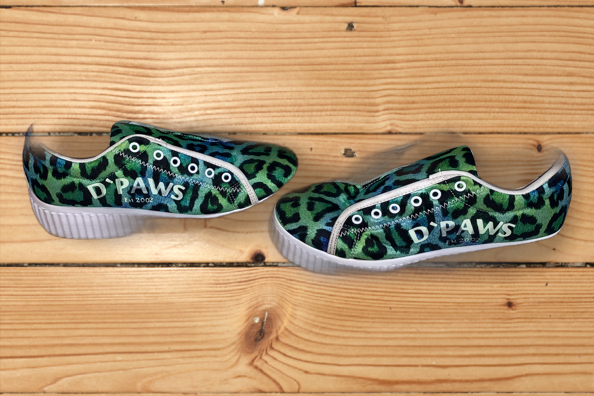 Women's Adult sized 7.5 US/38 EU, Green Leopard print canvas sneakers. Has "D'PAWS" on side of both shoes using Glow-in-the-Dark vinyl.