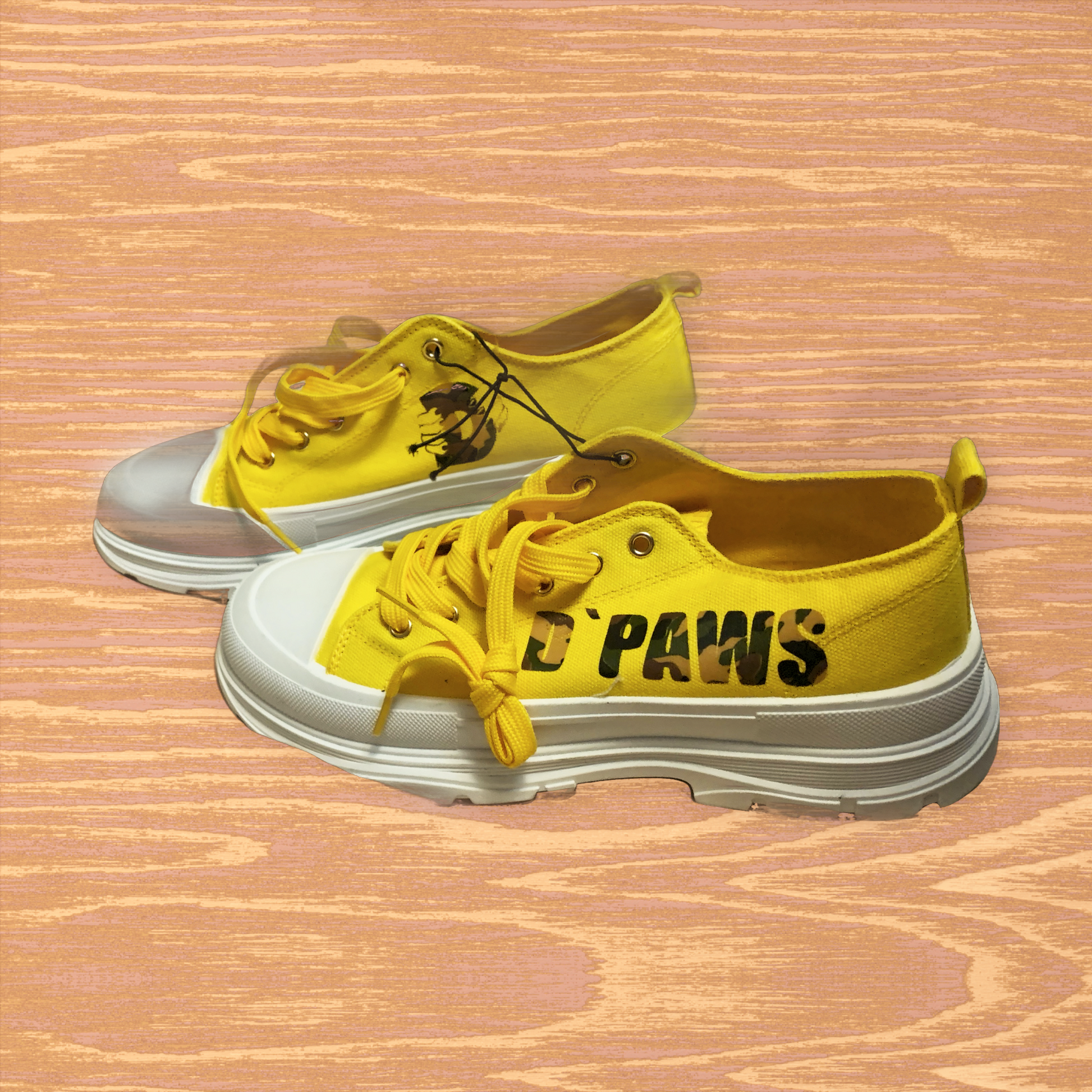 Yellow Canvas Sneakers with White Soles. "DPAWS" and Logo in Camouflage Vinyl on both shoes. Lace up sneakers.