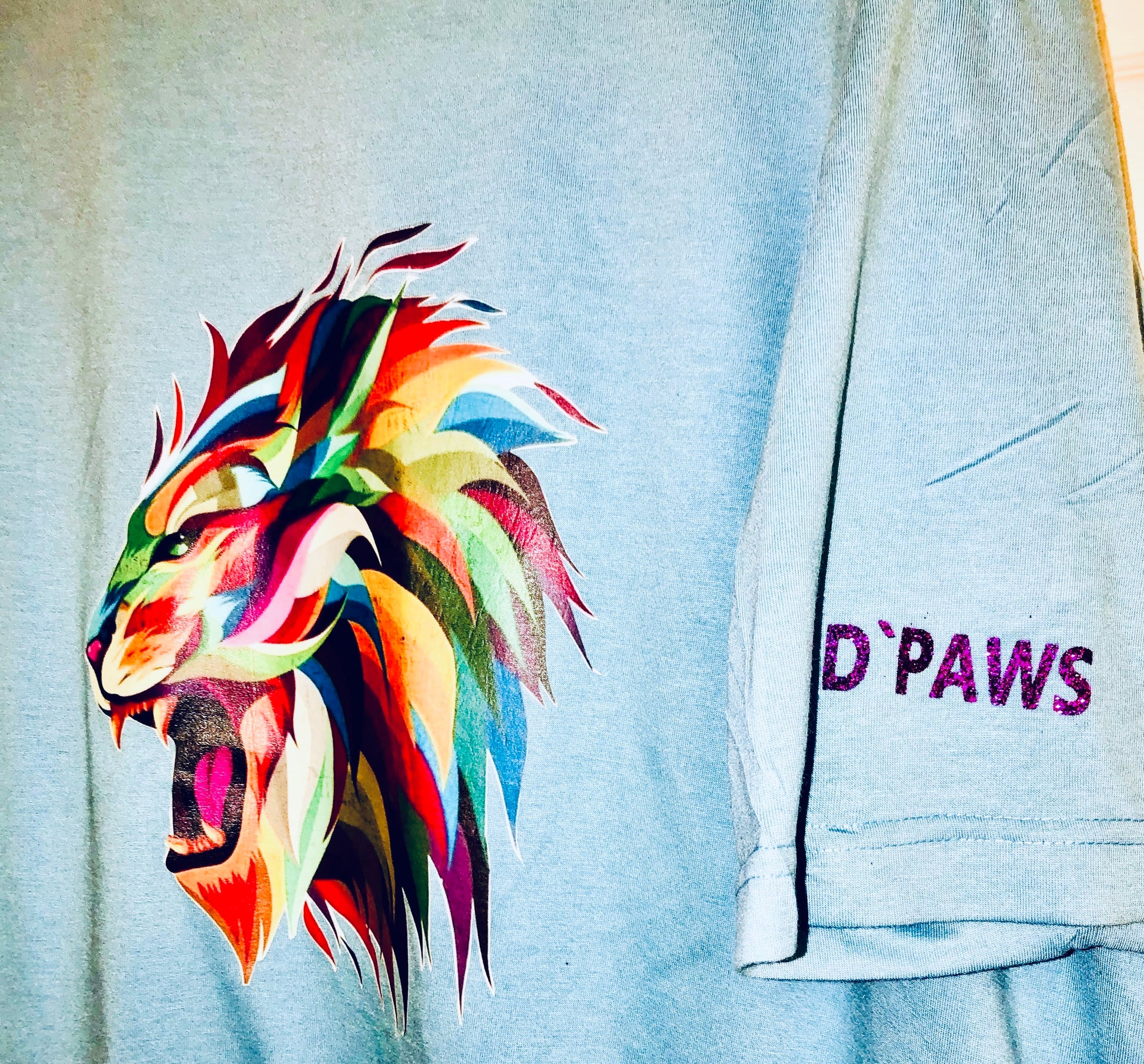 Adult sized, short sleeved, cotton blend t-shirt with lion in multicolored heat press vinyl.