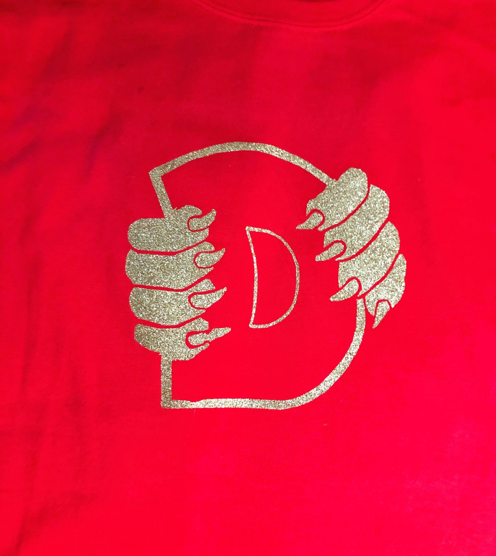 Adult sized, short sleeved, Red T-Shirt. Has outline of our logo in Gold Glitter Vinyl on front.