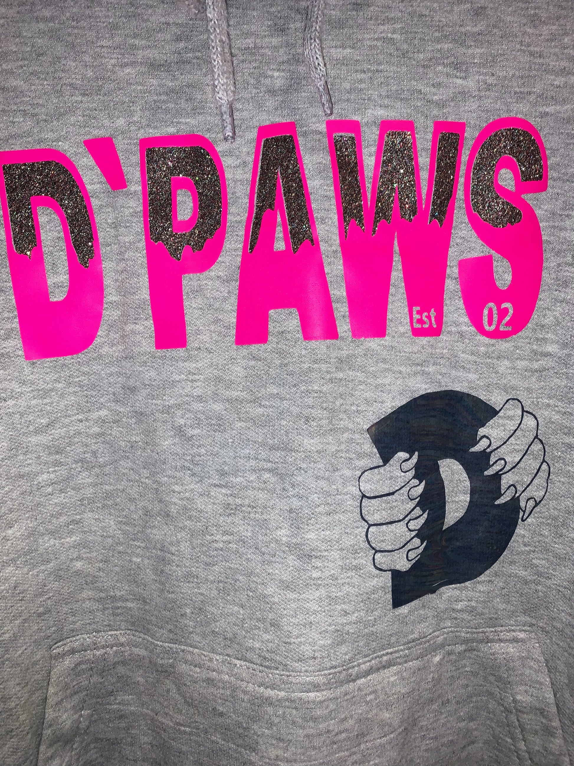 Adult sized, Gray Pullover Hoodie with drawstring hood. Has front pocket. "D'PAWS" i8n Hot Pink and Silver Vinyl. Logo in Black Glitter Vinyl.