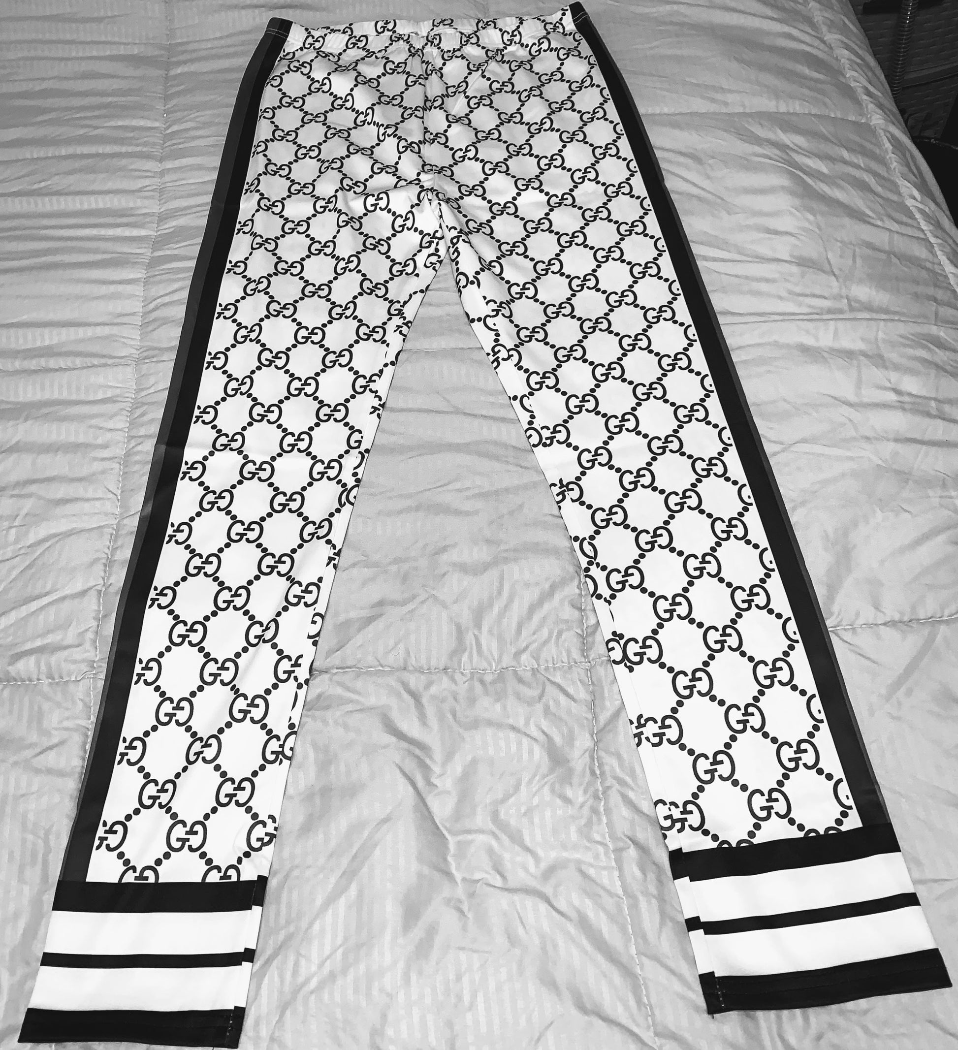Bottom is ankle length pants, White with Black stripes down the sides of both legs and ankles. Has elastic waist band.